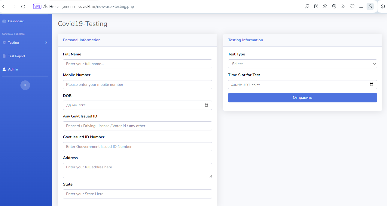 - This section divided into two parts. One is for new user and another one is for registered user. New user(First-time user) needs to provide personal and testing Information. A registered user only needs to provide test information, their personal information will be fetched from the database.