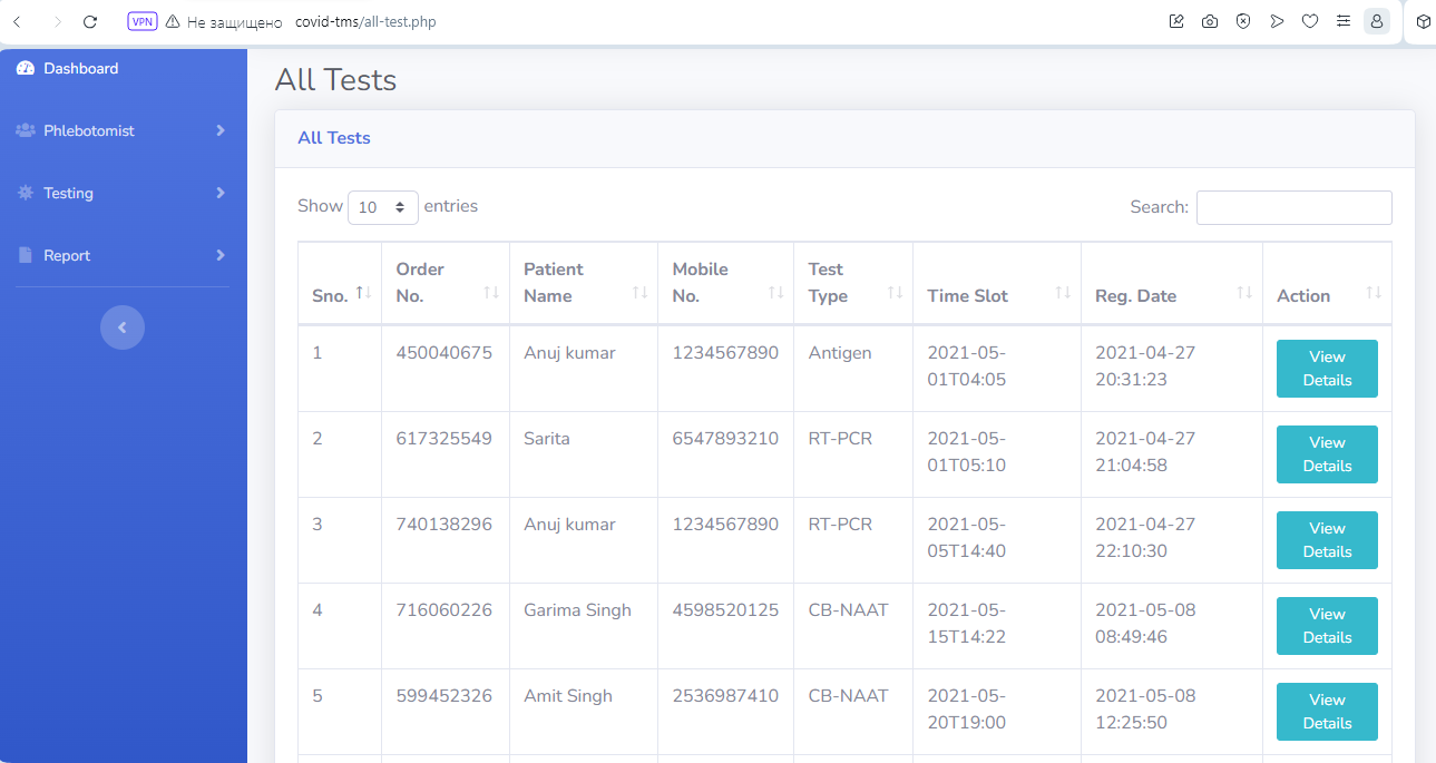 - In this section, the admin can manage all the tests like assign the test to Phlebotomist and update the history.